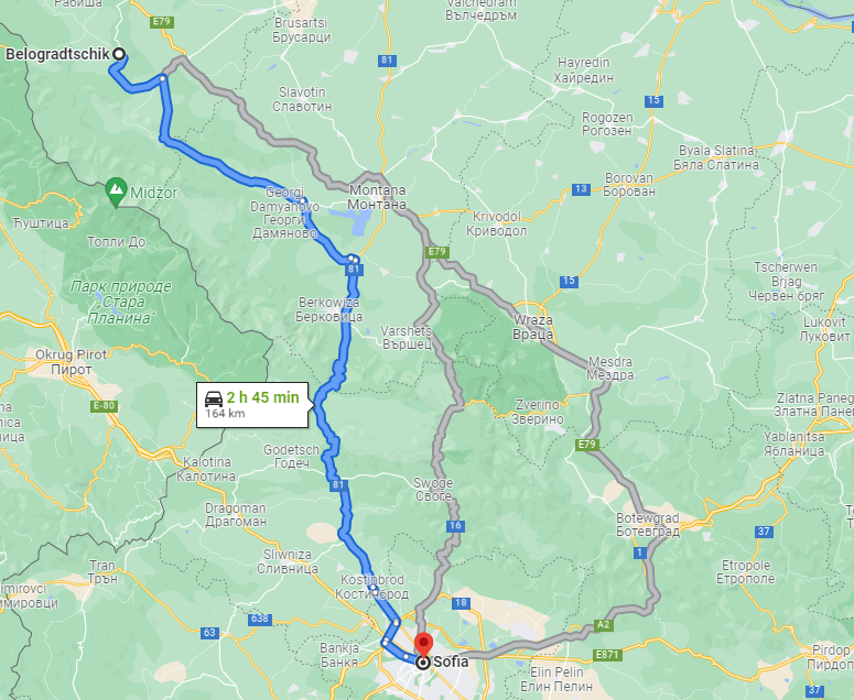 We left Serbia in the afternoon and thought that it would take us about 3 hours to reach Belogradtschik. So why hurry? Well … the closest border crossing point was closed for ordinary cars so 3 hours turned out to be more like 5-6. That is not a problem in itslef, but it quickly starts to look like one if the roads you have to take are narrow and lead through villages where you as a tourist turn into the main attraction of the day. Roads were not lit like at all and less than stellar. At some point we drove by a farm and it felt like being in the wild west, because we passed a “cowboy” on a black horse without a shirt leaving his farm. Somehow we managed to reach Belogradtschick though and the apartment was perfect. We even made it in time to see an important football game. At least it was one according to my husband and son 🙂 This is the route through Bulgaria.